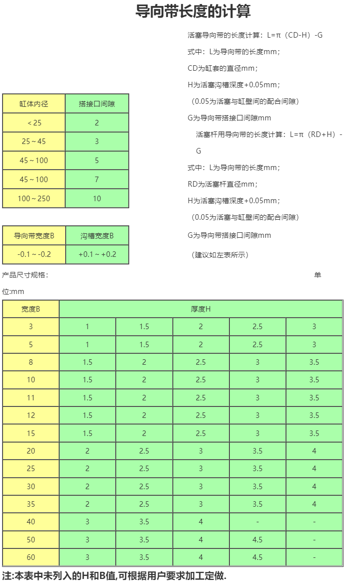 導(dǎo)向帶的幾何形狀一般多采用“矩”形扁平帶材.其厚度就根據(jù)活塞或缸體的溝槽深度與缸體與活塞或活塞桿間的配合間隙總和的0.05mm負(fù)公差.即h=H-0.05mm。導(dǎo)向帶的寬度則為溝槽寬度-0.1~0.2mm。導(dǎo)向帶的接口則采用45°或60°的斜搭口為宜。